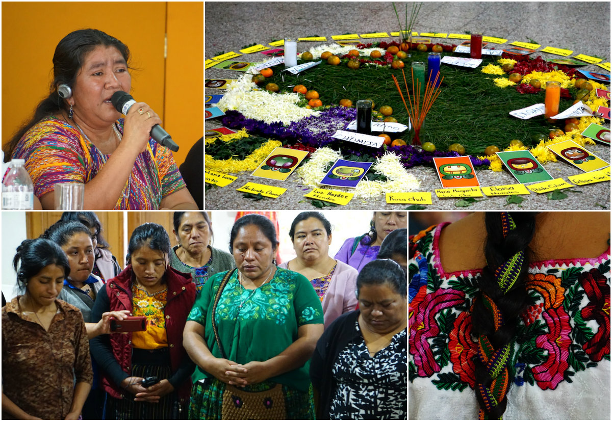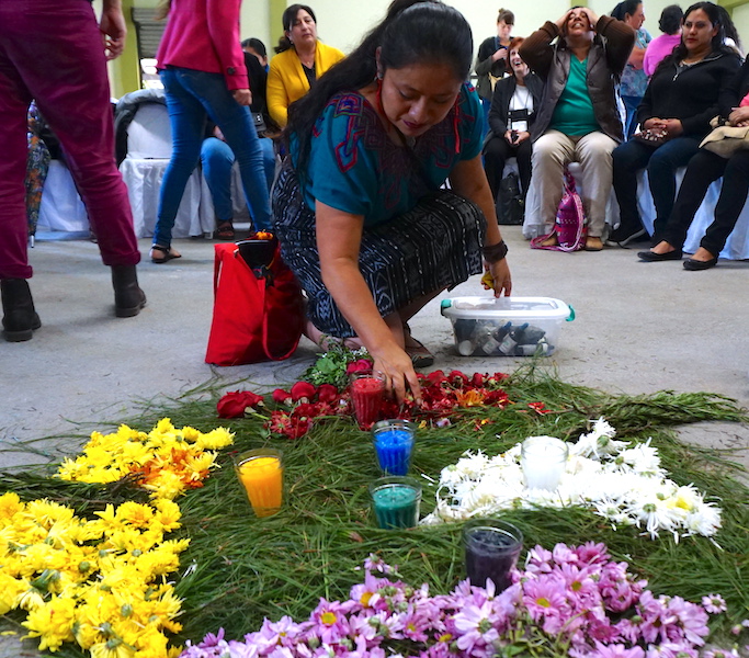 Our meeting began with a Maya ceremony. At the centre of the room, six coloured candles sat on a beautiful wreath of grass and flowers — one for each of the colours that guide the vision and life of the Indigenous Xinka people: blue for water; white for air and voices; green for plants and mountains; red for humanity, blood and animals; yellow for life and sun; and black for night, sundown and the jet black hair of the people. We prayed together as the candles were lit, and sat down to hear testimony from the women.