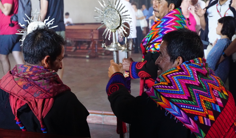 Today, they play host to women and children weaving flower bundles, selling knick knacks, having lunch or lighting prayer candles for loved ones lost or in honour of patron saints. Many K’iche priests still use the church for rituals, and I was fortunate to be there at the exact moment that one took place: a group of holy men dressed in brightly-coloured robes carried a massive cross on their shoulders through the market and into the church, amid fumes from swinging incense. A procession of men carrying staffs of wood and brass followed, praying as the clerics marched. The group raised the crucifix inside the church with ropes, lit candles and prayed at its base as tourists looked on. Photos aren’t allowed inside, but I didn’t know that at the time, and managed to take few snapshots.