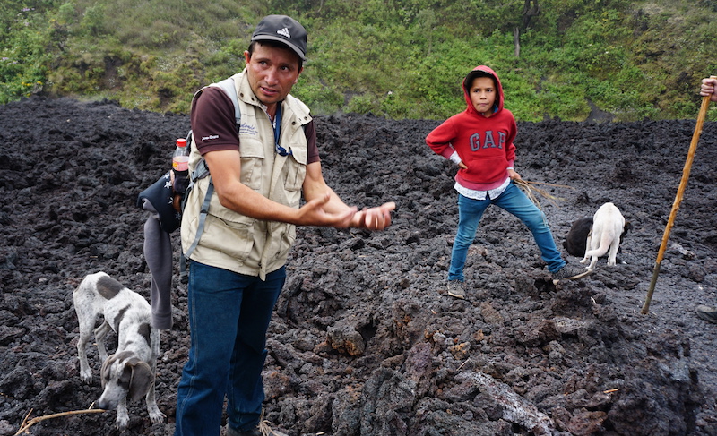 The first hour of the hike was uneventful. We marched uphill through dirt and shrubbery, until the dirt became volcanic rock, the climb became level, and the foul smell of sulphur filled our lungs. Nery pointed through the fog to something red glowing in the distance: Volcán Fuego, he explained, and the spewing lava at its tip. Our escort of boys and horses left us there, and were replaced by two pooches, who had been napping on the warmth of the volcanic rocks and decided to follow us.