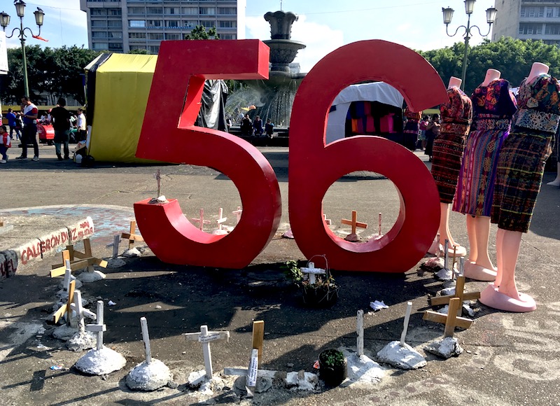 At the time of my visit, at the footsteps of the palace (just beyond the textile tents) stood a large red monument — the number 56 — surrounded by crosses, plants and spray-painted messages. It was a tribute to the 56 girls impacted by the tragic shelter fire, 41 of whom were killed while the rest were seriously injured. It was the disaster that Estefani, who spoke with me earlier in the week, survived, and the disaster that brought Guatemala’s femicide crisis back to the forefront of political discussion through a campaign called Nos Duelen 56. According to Guatemala’s Public Ministry, 415,514 criminal cases of violence against women were registered between January 2009 and April 2017, and in 2016, 67,073 legal complaints were registered — an increase of 236 per cent from 2009. Between April 2014 and April 2017, the ministry reports, at least 897 women were murdered.