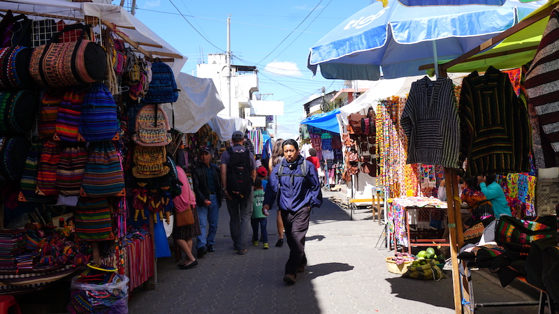 Women dressed in traditional guipils carried baskets of the stuff for sale on their heads, and many pounds more in the form of textiles draped over their arms and shoulders. They must have incredible upper body strength, I thought, in addition to tolerance for blistering heat — I was sweating in a tank top, as they carried layers of blankets up to 12 inches thick on each arm. Be warned, however: to walk through the market’s streets is also to expose yourself to the potential for tremendous pestering. At least, that was my experience as a tourist who presumably, is the target audience for scarves, handbags and blankets. Some of the women followed me for up to 10 minutes at a time, aggressively trying to close a deal.