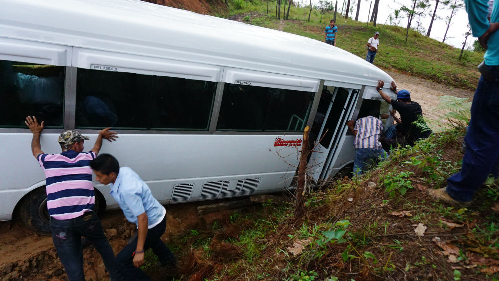 It was a sombre day that ended with a bit of an adrenaline rush. We were sitting in the bus with some Lenca men from out of town, when it started sliding uncontrollably down the slick wet mountain. We hopped out quickly as the bus continued to slip on switchbacks without protective railing. Our guests heaved the bus out of the mud and tried to keep it from teetering over the edge of the cliffs — a feat that nearly cost two or three of them their lives as the vehicle crushed them into a curve. Men on horses jumped out of the way and we walked in the rain until more trucks could come to pick us up.